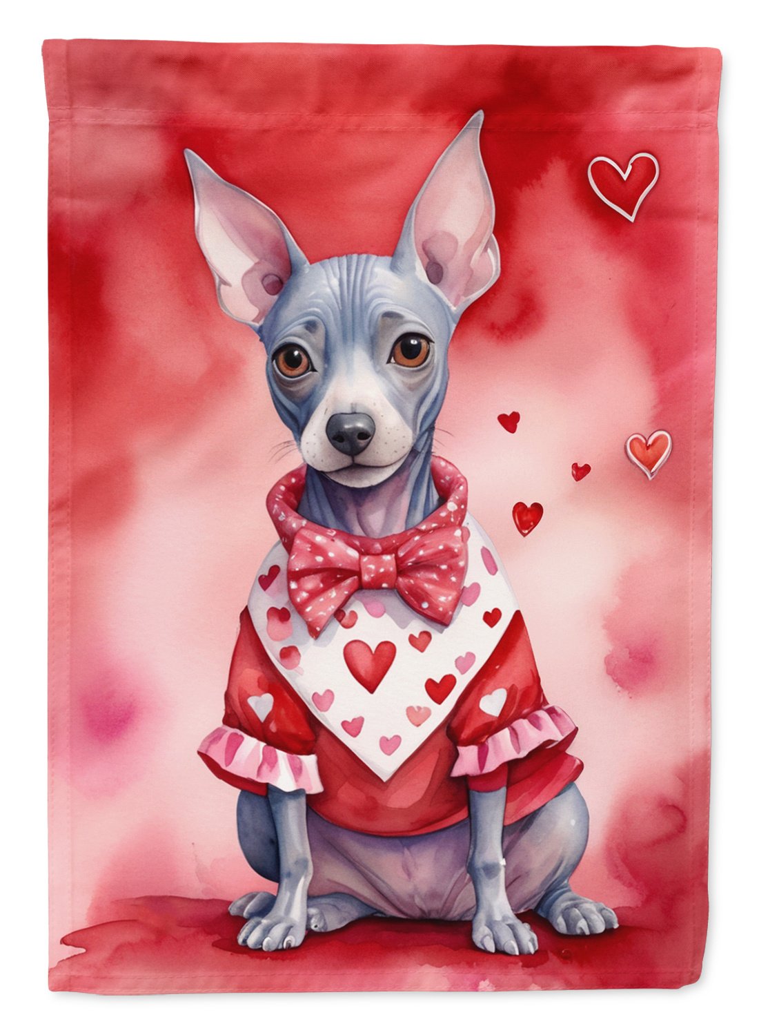 House Flag featuring breed specific American Hairless Terrier artwork. Celebrate Valentine's Day with this Valentine's Day Large Flag. Presenting our Heavy Duty Polyester House Size Decorative Sleeve Pole Flag, a vibrant addition to enhance the aesthetic appeal of your home. This large decorative flag, measuring approximately 28 x 40 inches, offers ample coverage and visibility. Each flag is meticulously sewn and made individually, ensuring a unique piece that may slightly vary in size. It's a sleeve pole flag, designed to fit a standard decorative flag pole effortlessly. Please note that the flag pole and bracket are not included and should be purchased separately. What sets our flag apart is its dual-sided print. The design is mirrored on both sides of the fabric, allowing for uniform visibility regardless of the angle. Printed in full color, our flag showcases vibrant hues that truly stand out. To ensure lasting vibrancy and durability, the dyes are heat-set into the fabric. This ensures your flag remains bright and captivating through various weather conditions. Elevate the look of your home with our Heavy Duty Polyester House Size Decorative Sleeve Pole Flag!