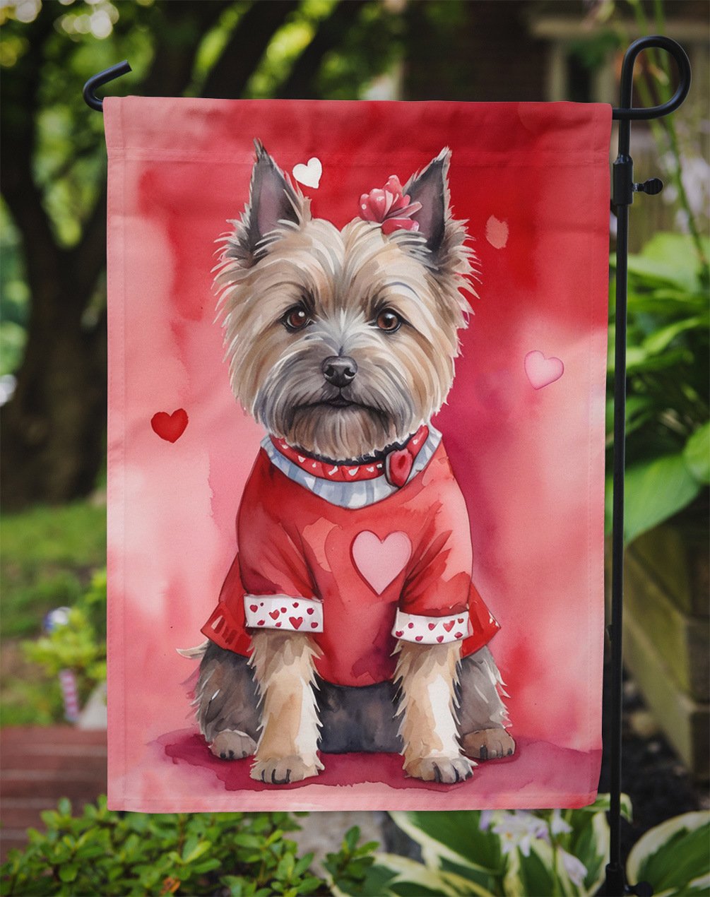 Garden Flag featuring breed specific Cairn Terrier artwork. Celebrate Valentine's Day with this Valentine's Day Garden Flag. Enhance the beauty of your garden, patio, or yard with Caroline's Treasures Decorative Garden Flag, proudly made in the USA. Crafted from two pieces of thick, double-sided polyester fabric, this 2-ply garden flag is designed to withstand various weather conditions, making it water-resistant and weatherproof. Featuring correctly readable words on both sides, this garden flag offers a delightful visual experience from any angle. With its heavier weight, it stands out among other garden flags, ensuring stability and durability even in wind, rain, and snow. Measuring approximately 11 1/4 inches by 15 1/2 inches, this flag allows you to personalize your outdoor decor. It comes with a 1 1/2-inch sleeve sewn in, allowing easy attachment to any standard garden flag stand or garden size porch hanger (sold separately). Make a statement in your outdoor space with Caroline's Treasures Decorative Garden Flag, a vibrant and high-quality flag that adds color and personality to your surroundings. Proudly made in the USA, it's a symbol of quality craftsmanship and attention to detail.