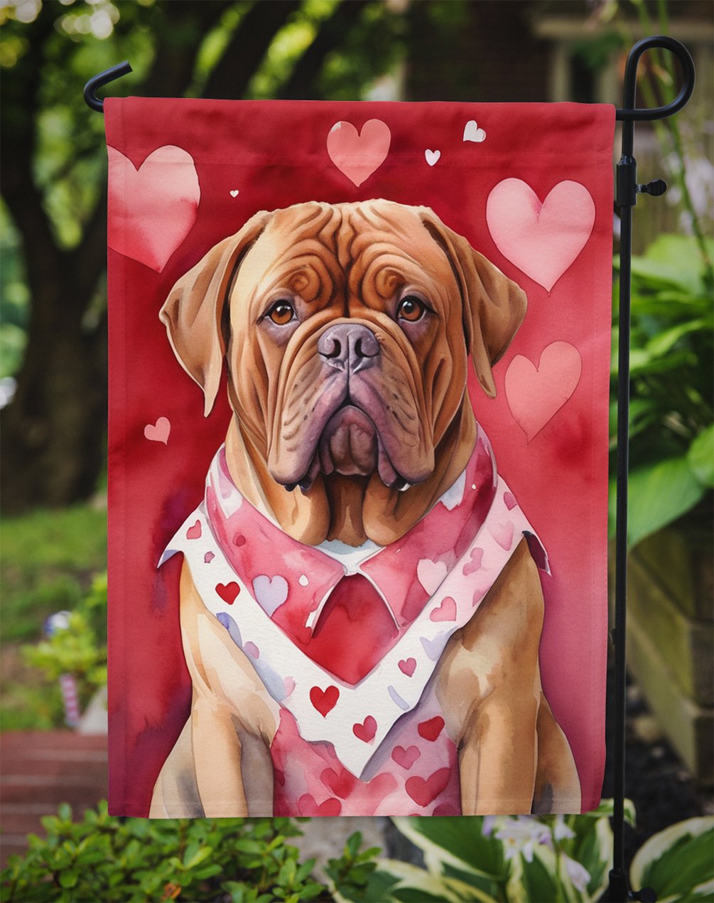Garden Flag featuring breed specific Dogue de Bordeaux artwork. Celebrate Valentine's Day with this Valentine's Day Garden Flag. Enhance the beauty of your garden, patio, or yard with Caroline's Treasures Decorative Garden Flag, proudly made in the USA. Crafted from two pieces of thick, double-sided polyester fabric, this 2-ply garden flag is designed to withstand various weather conditions, making it water-resistant and weatherproof. Featuring correctly readable words on both sides, this garden flag offers a delightful visual experience from any angle. With its heavier weight, it stands out among other garden flags, ensuring stability and durability even in wind, rain, and snow. Measuring approximately 11 1/4 inches by 15 1/2 inches, this flag allows you to personalize your outdoor decor. It comes with a 1 1/2-inch sleeve sewn in, allowing easy attachment to any standard garden flag stand or garden size porch hanger (sold separately). Make a statement in your outdoor space with Caroline's Treasures Decorative Garden Flag, a vibrant and high-quality flag that adds color and personality to your surroundings. Proudly made in the USA, it's a symbol of quality craftsmanship and attention to detail.