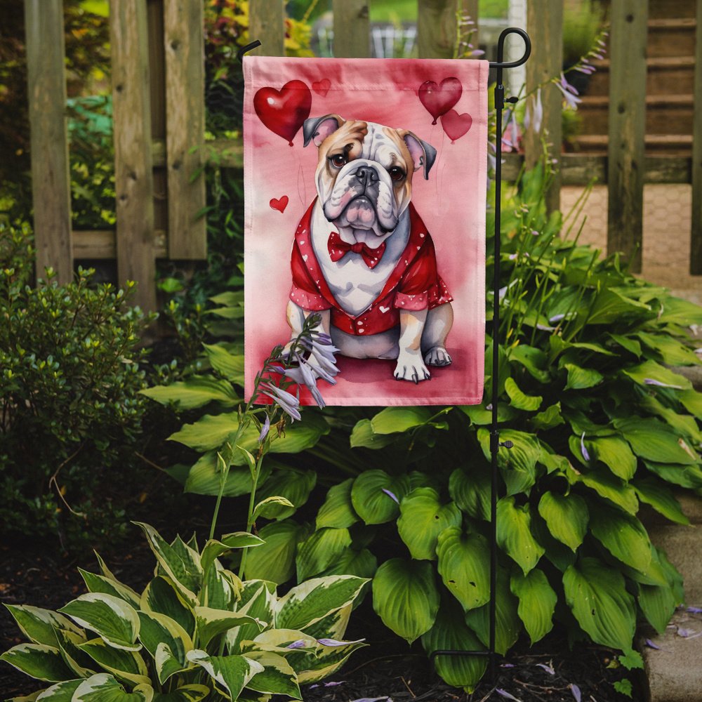 Garden Flag featuring breed specific English Bulldog artwork. Celebrate Valentine's Day with this Valentine's Day Garden Flag. Enhance the beauty of your garden, patio, or yard with Caroline's Treasures Decorative Garden Flag, proudly made in the USA. Crafted from two pieces of thick, double-sided polyester fabric, this 2-ply garden flag is designed to withstand various weather conditions, making it water-resistant and weatherproof. Featuring correctly readable words on both sides, this garden flag offers a delightful visual experience from any angle. With its heavier weight, it stands out among other garden flags, ensuring stability and durability even in wind, rain, and snow. Measuring approximately 11 1/4 inches by 15 1/2 inches, this flag allows you to personalize your outdoor decor. It comes with a 1 1/2-inch sleeve sewn in, allowing easy attachment to any standard garden flag stand or garden size porch hanger (sold separately). Make a statement in your outdoor space with Caroline's Treasures Decorative Garden Flag, a vibrant and high-quality flag that adds color and personality to your surroundings. Proudly made in the USA, it's a symbol of quality craftsmanship and attention to detail.