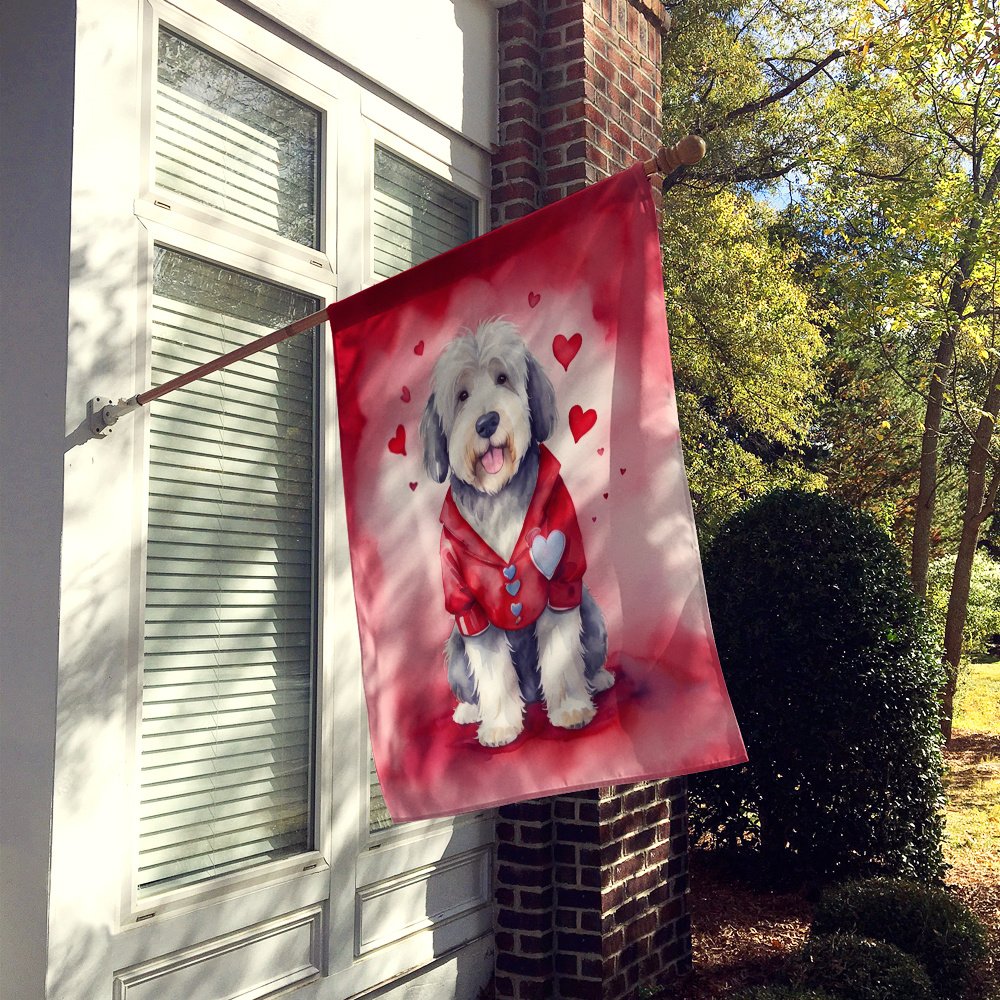 House Flag featuring breed specific Old English Sheepdog artwork. Celebrate Valentine's Day with this Valentine's Day Large Flag. Presenting our Heavy Duty Polyester House Size Decorative Sleeve Pole Flag, a vibrant addition to enhance the aesthetic appeal of your home. This large decorative flag, measuring approximately 28 x 40 inches, offers ample coverage and visibility. Each flag is meticulously sewn and made individually, ensuring a unique piece that may slightly vary in size. It's a sleeve pole flag, designed to fit a standard decorative flag pole effortlessly. Please note that the flag pole and bracket are not included and should be purchased separately. What sets our flag apart is its dual-sided print. The design is mirrored on both sides of the fabric, allowing for uniform visibility regardless of the angle. Printed in full color, our flag showcases vibrant hues that truly stand out. To ensure lasting vibrancy and durability, the dyes are heat-set into the fabric. This ensures your flag remains bright and captivating through various weather conditions. Elevate the look of your home with our Heavy Duty Polyester House Size Decorative Sleeve Pole Flag!