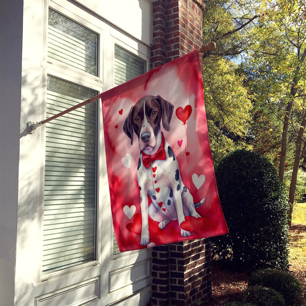 House Flag featuring breed specific Pointer artwork. Celebrate Valentine's Day with this Valentine's Day Large Flag. Presenting our Heavy Duty Polyester House Size Decorative Sleeve Pole Flag, a vibrant addition to enhance the aesthetic appeal of your home. This large decorative flag, measuring approximately 28 x 40 inches, offers ample coverage and visibility. Each flag is meticulously sewn and made individually, ensuring a unique piece that may slightly vary in size. It's a sleeve pole flag, designed to fit a standard decorative flag pole effortlessly. Please note that the flag pole and bracket are not included and should be purchased separately. What sets our flag apart is its dual-sided print. The design is mirrored on both sides of the fabric, allowing for uniform visibility regardless of the angle. Printed in full color, our flag showcases vibrant hues that truly stand out. To ensure lasting vibrancy and durability, the dyes are heat-set into the fabric. This ensures your flag remains bright and captivating through various weather conditions. Elevate the look of your home with our Heavy Duty Polyester House Size Decorative Sleeve Pole Flag!