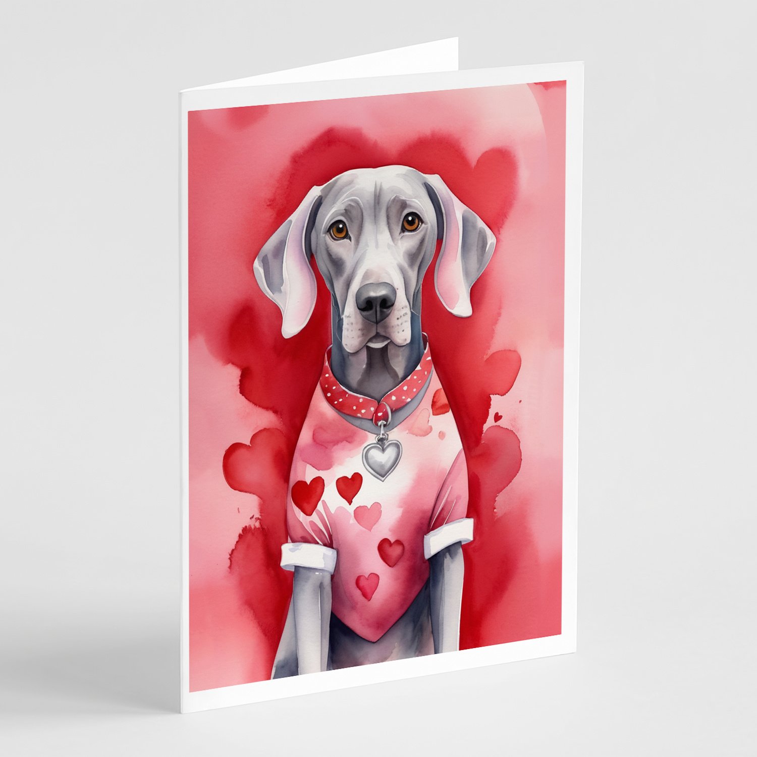 Greeting Cards Pack of 8 featuring breed specific Weimaraner artwork. Celebrate Valentine's Day with this Valentine's Day . Celebrate special moments with Caroline's Treasures Printed Greeting Card Pack. This pack includes eight beautifully folded 5x7 cards, accompanied by eight matching white envelopes. With blank interiors, these cards provide ample space for your personalized messages and heartfelt holiday greetings. Each card features captivating full-color artwork, meticulously printed in our facility on high-quality 80 lb cover stock or 216 GSM. The super smooth finish of the white cards enhances the visual impact of the artwork, creating a truly stunning presentation. Designed by our talented in-house artists or licensed artists, the artwork on these cards showcases their creativity and attention to detail. From vibrant illustrations to captivating designs, each card tells its own unique story. Whether it's for birthdays, anniversaries, holidays, or any special occasion, Caroline's Treasures Greeting Card Pack is the perfect way to convey your heartfelt sentiments. Share joy, love, and warm wishes with these exquisite cards and make every moment unforgettable.