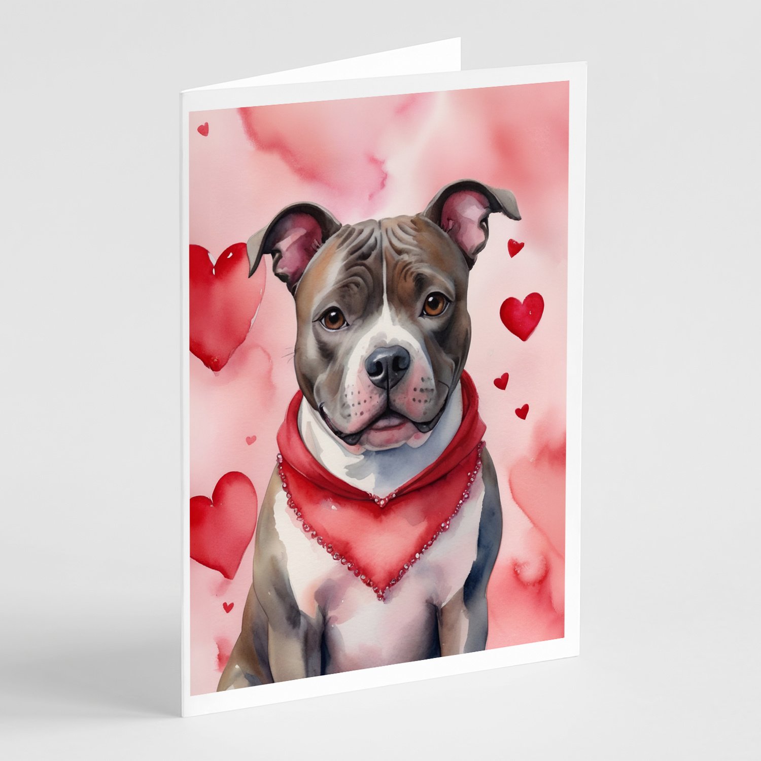 Greeting Cards Pack of 8 featuring breed specific Staffordshire Bull Terrier artwork. Celebrate Valentine's Day with this Valentine's Day . Celebrate special moments with Caroline's Treasures Printed Greeting Card Pack. This pack includes eight beautifully folded 5x7 cards, accompanied by eight matching white envelopes. With blank interiors, these cards provide ample space for your personalized messages and heartfelt holiday greetings. Each card features captivating full-color artwork, meticulously printed in our facility on high-quality 80 lb cover stock or 216 GSM. The super smooth finish of the white cards enhances the visual impact of the artwork, creating a truly stunning presentation. Designed by our talented in-house artists or licensed artists, the artwork on these cards showcases their creativity and attention to detail. From vibrant illustrations to captivating designs, each card tells its own unique story. Whether it's for birthdays, anniversaries, holidays, or any special occasion, Caroline's Treasures Greeting Card Pack is the perfect way to convey your heartfelt sentiments. Share joy, love, and warm wishes with these exquisite cards and make every moment unforgettable.