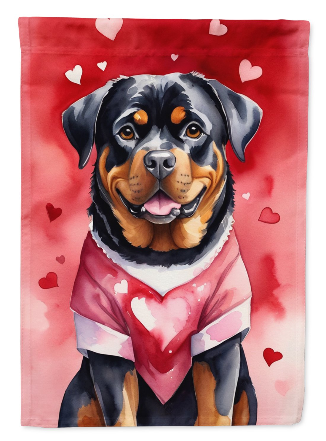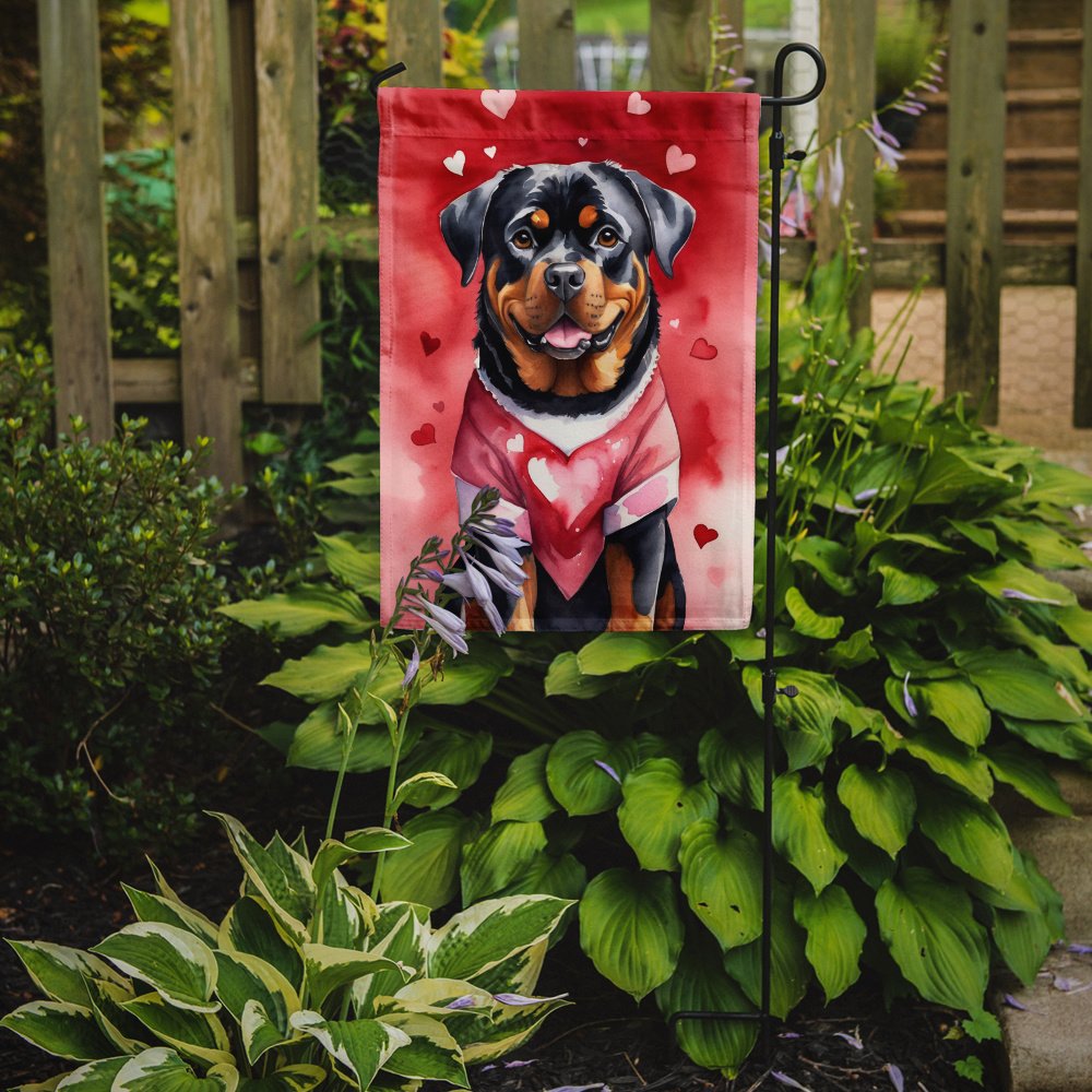 Garden Flag featuring breed specific Rottweiler artwork. Celebrate Valentine's Day with this Valentine's Day Garden Flag. Enhance the beauty of your garden, patio, or yard with Caroline's Treasures Decorative Garden Flag, proudly made in the USA. Crafted from two pieces of thick, double-sided polyester fabric, this 2-ply garden flag is designed to withstand various weather conditions, making it water-resistant and weatherproof. Featuring correctly readable words on both sides, this garden flag offers a delightful visual experience from any angle. With its heavier weight, it stands out among other garden flags, ensuring stability and durability even in wind, rain, and snow. Measuring approximately 11 1/4 inches by 15 1/2 inches, this flag allows you to personalize your outdoor decor. It comes with a 1 1/2-inch sleeve sewn in, allowing easy attachment to any standard garden flag stand or garden size porch hanger (sold separately). Make a statement in your outdoor space with Caroline's Treasures Decorative Garden Flag, a vibrant and high-quality flag that adds color and personality to your surroundings. Proudly made in the USA, it's a symbol of quality craftsmanship and attention to detail.