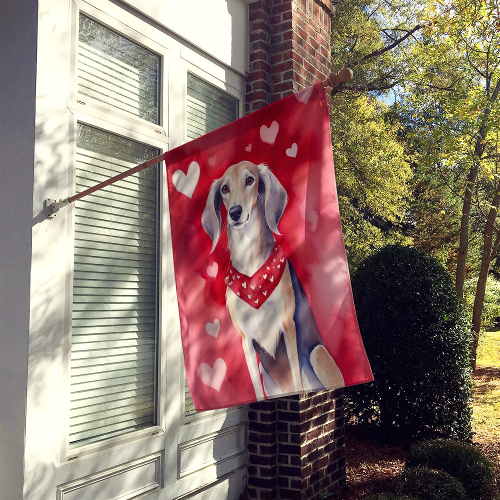 House Flag featuring breed specific Saluki artwork. Celebrate Valentine's Day with this Valentine's Day Large Flag. Presenting our Heavy Duty Polyester House Size Decorative Sleeve Pole Flag, a vibrant addition to enhance the aesthetic appeal of your home. This large decorative flag, measuring approximately 28 x 40 inches, offers ample coverage and visibility. Each flag is meticulously sewn and made individually, ensuring a unique piece that may slightly vary in size. It's a sleeve pole flag, designed to fit a standard decorative flag pole effortlessly. Please note that the flag pole and bracket are not included and should be purchased separately. What sets our flag apart is its dual-sided print. The design is mirrored on both sides of the fabric, allowing for uniform visibility regardless of the angle. Printed in full color, our flag showcases vibrant hues that truly stand out. To ensure lasting vibrancy and durability, the dyes are heat-set into the fabric. This ensures your flag remains bright and captivating through various weather conditions. Elevate the look of your home with our Heavy Duty Polyester House Size Decorative Sleeve Pole Flag!