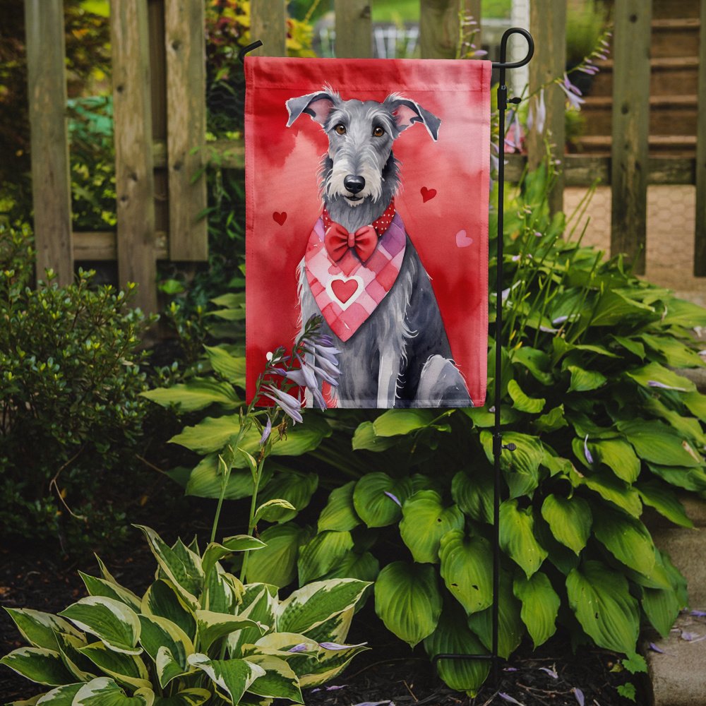 Garden Flag featuring breed specific Scottish Deerhound artwork. Celebrate Valentine's Day with this Valentine's Day Garden Flag. Enhance the beauty of your garden, patio, or yard with Caroline's Treasures Decorative Garden Flag, proudly made in the USA. Crafted from two pieces of thick, double-sided polyester fabric, this 2-ply garden flag is designed to withstand various weather conditions, making it water-resistant and weatherproof. Featuring correctly readable words on both sides, this garden flag offers a delightful visual experience from any angle. With its heavier weight, it stands out among other garden flags, ensuring stability and durability even in wind, rain, and snow. Measuring approximately 11 1/4 inches by 15 1/2 inches, this flag allows you to personalize your outdoor decor. It comes with a 1 1/2-inch sleeve sewn in, allowing easy attachment to any standard garden flag stand or garden size porch hanger (sold separately). Make a statement in your outdoor space with Caroline's Treasures Decorative Garden Flag, a vibrant and high-quality flag that adds color and personality to your surroundings. Proudly made in the USA, it's a symbol of quality craftsmanship and attention to detail.