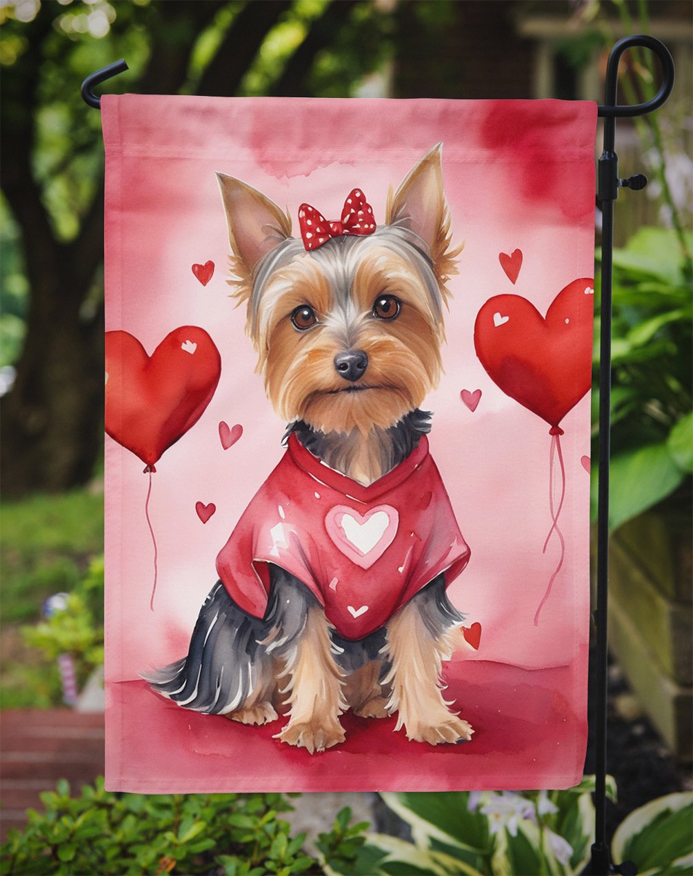 Garden Flag featuring breed specific Silky Terrier artwork. Celebrate Valentine's Day with this Valentine's Day Garden Flag. Enhance the beauty of your garden, patio, or yard with Caroline's Treasures Decorative Garden Flag, proudly made in the USA. Crafted from two pieces of thick, double-sided polyester fabric, this 2-ply garden flag is designed to withstand various weather conditions, making it water-resistant and weatherproof. Featuring correctly readable words on both sides, this garden flag offers a delightful visual experience from any angle. With its heavier weight, it stands out among other garden flags, ensuring stability and durability even in wind, rain, and snow. Measuring approximately 11 1/4 inches by 15 1/2 inches, this flag allows you to personalize your outdoor decor. It comes with a 1 1/2-inch sleeve sewn in, allowing easy attachment to any standard garden flag stand or garden size porch hanger (sold separately). Make a statement in your outdoor space with Caroline's Treasures Decorative Garden Flag, a vibrant and high-quality flag that adds color and personality to your surroundings. Proudly made in the USA, it's a symbol of quality craftsmanship and attention to detail.