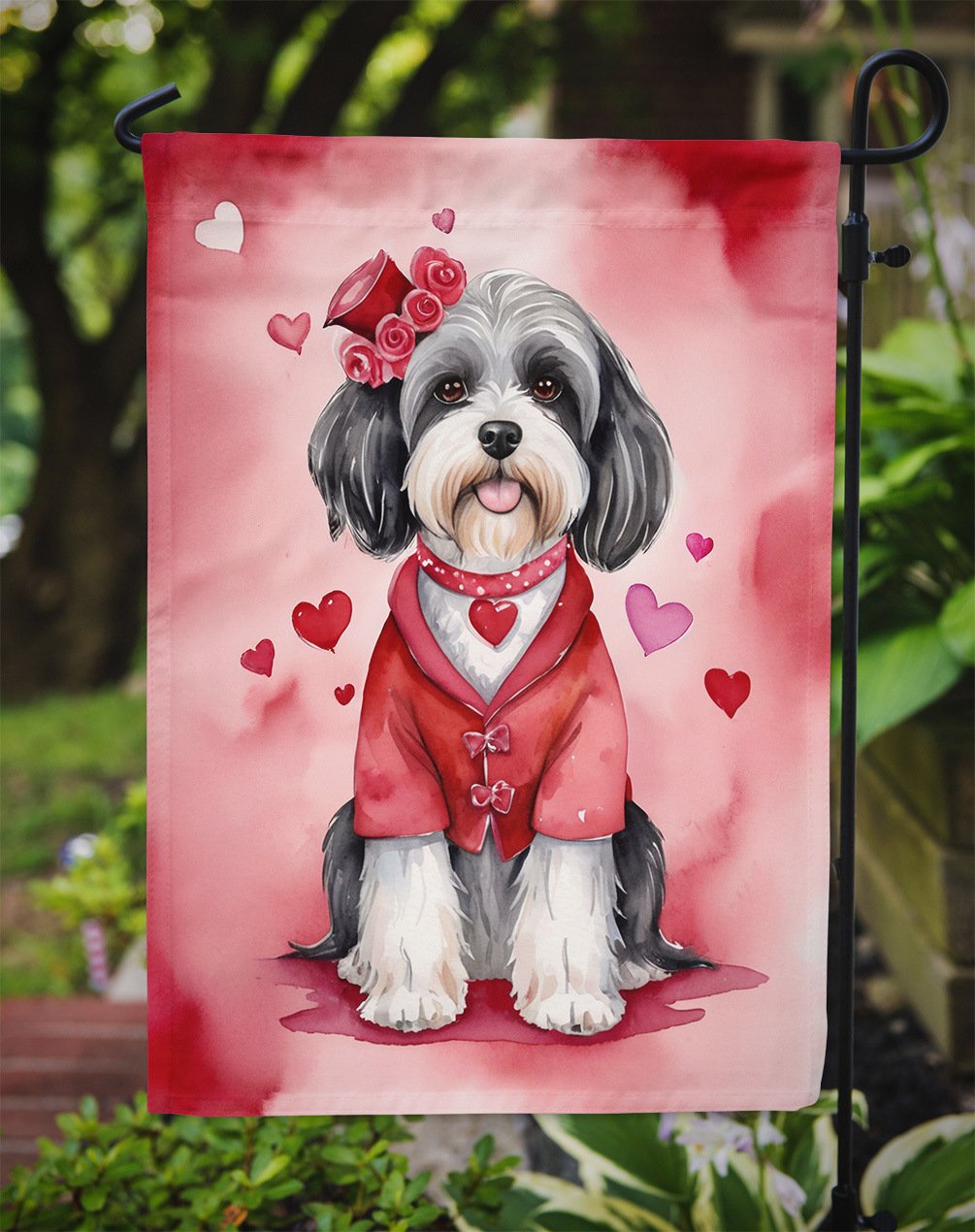 Garden Flag featuring breed specific Tibetan Terrier artwork. Celebrate Valentine's Day with this Valentine's Day Garden Flag. Enhance the beauty of your garden, patio, or yard with Caroline's Treasures Decorative Garden Flag, proudly made in the USA. Crafted from two pieces of thick, double-sided polyester fabric, this 2-ply garden flag is designed to withstand various weather conditions, making it water-resistant and weatherproof. Featuring correctly readable words on both sides, this garden flag offers a delightful visual experience from any angle. With its heavier weight, it stands out among other garden flags, ensuring stability and durability even in wind, rain, and snow. Measuring approximately 11 1/4 inches by 15 1/2 inches, this flag allows you to personalize your outdoor decor. It comes with a 1 1/2-inch sleeve sewn in, allowing easy attachment to any standard garden flag stand or garden size porch hanger (sold separately). Make a statement in your outdoor space with Caroline's Treasures Decorative Garden Flag, a vibrant and high-quality flag that adds color and personality to your surroundings. Proudly made in the USA, it's a symbol of quality craftsmanship and attention to detail.