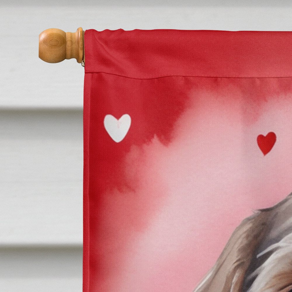 House Flag featuring breed specific Whippet artwork. Celebrate Valentine's Day with this Valentine's Day Large Flag. Presenting our Heavy Duty Polyester House Size Decorative Sleeve Pole Flag, a vibrant addition to enhance the aesthetic appeal of your home. This large decorative flag, measuring approximately 28 x 40 inches, offers ample coverage and visibility. Each flag is meticulously sewn and made individually, ensuring a unique piece that may slightly vary in size. It's a sleeve pole flag, designed to fit a standard decorative flag pole effortlessly. Please note that the flag pole and bracket are not included and should be purchased separately. What sets our flag apart is its dual-sided print. The design is mirrored on both sides of the fabric, allowing for uniform visibility regardless of the angle. Printed in full color, our flag showcases vibrant hues that truly stand out. To ensure lasting vibrancy and durability, the dyes are heat-set into the fabric. This ensures your flag remains bright and captivating through various weather conditions. Elevate the look of your home with our Heavy Duty Polyester House Size Decorative Sleeve Pole Flag!
